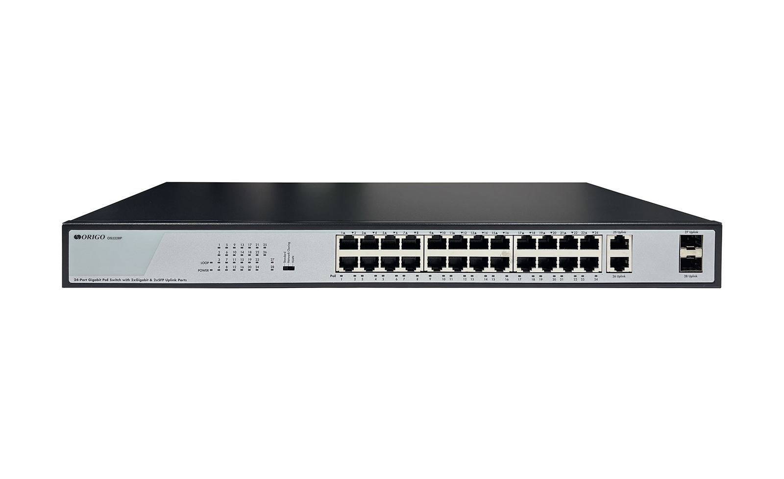 The OS2228P/370W is a gigabit configurable switch with 24x10/100/1000Base-T PoE+ ports, 2x10/100/1000Base-T ports, 2x1000Base-X SFP ports and a DIP Switch.