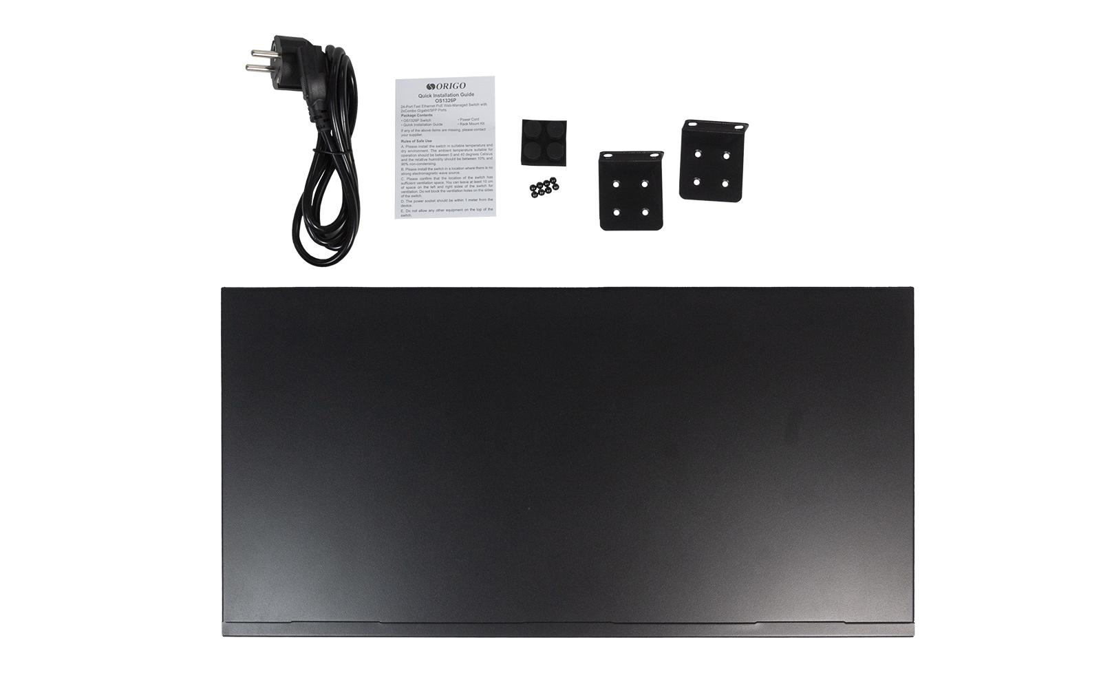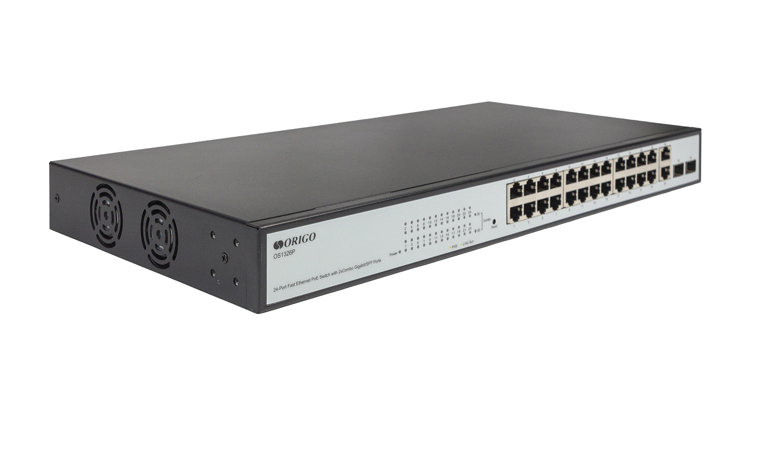 The ORIGO OS1326P/280W is a managed L2 switch with 24x10/100Base-TX PoE+ ports and 2xGigabit Combo 1000Base-T/SFP uplinks.