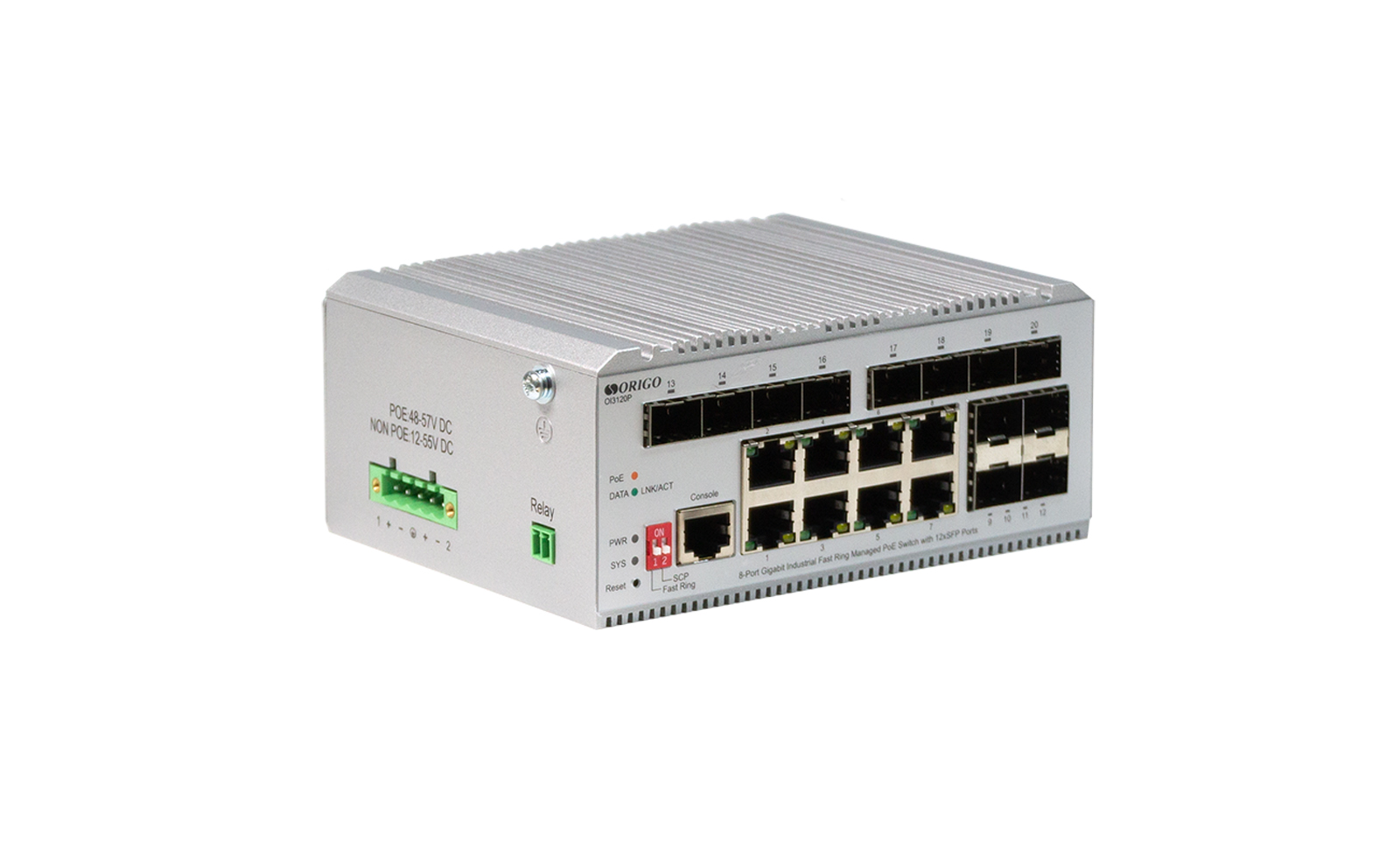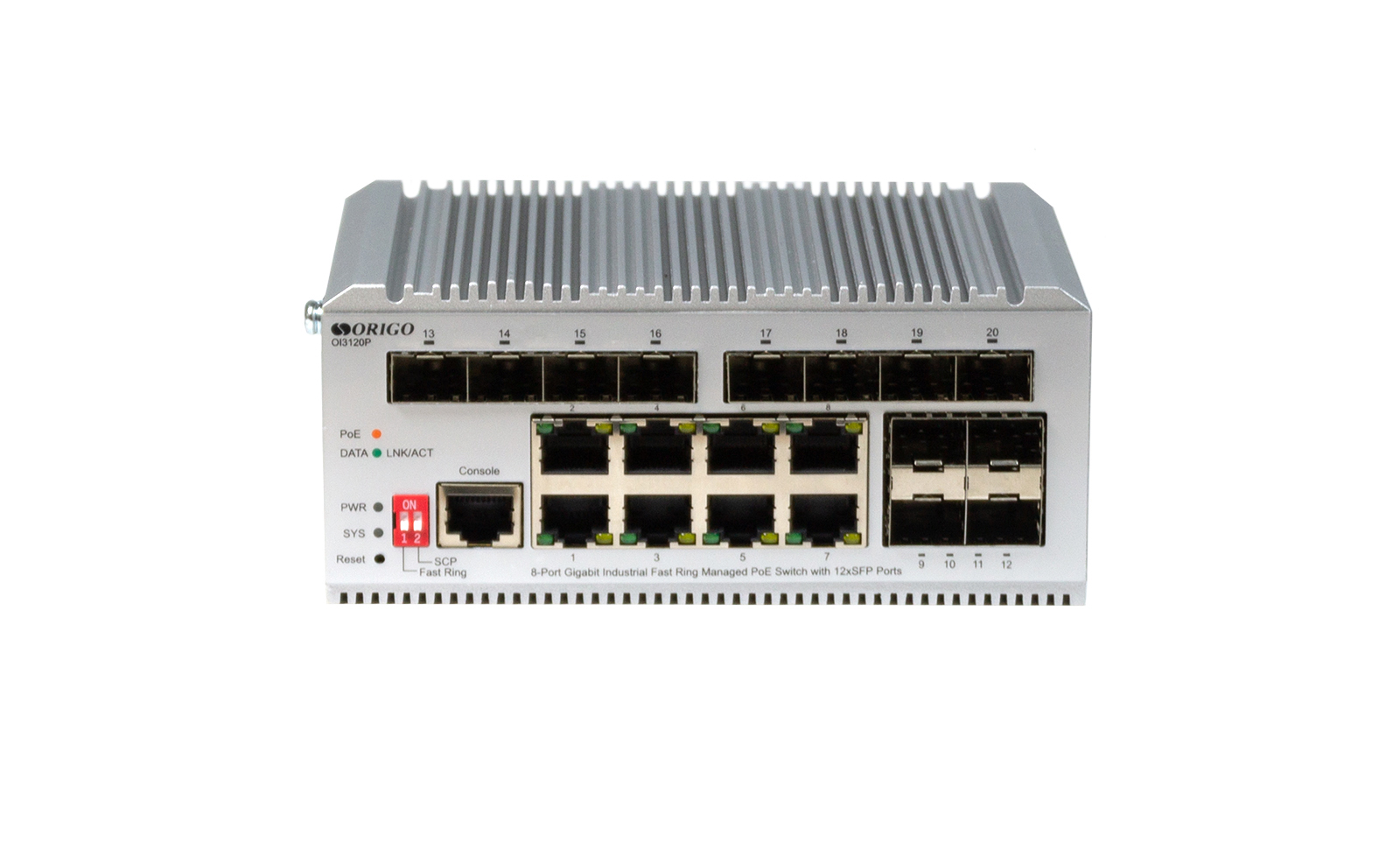 The ORIGO OI3120P/185W Industrial Layer 2 Managed Switch is equipped with 8x1000Base-T PoE+ ports and 12xSFP1 ports.