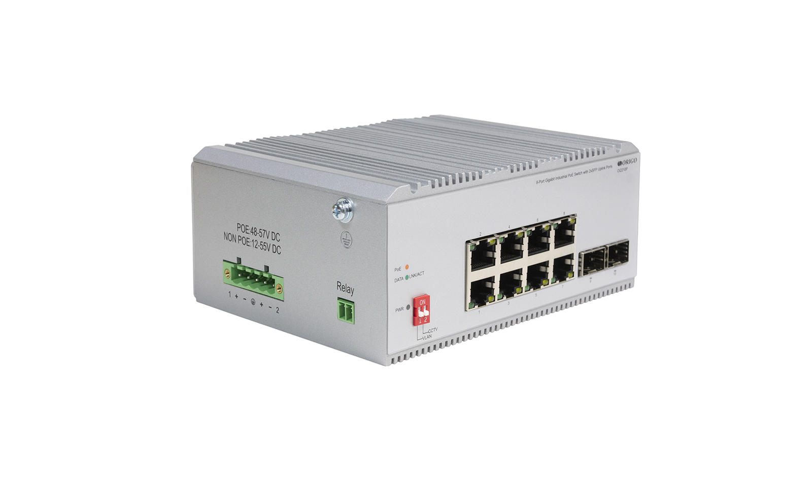 The ORIGO OI2210P/185W Industrial Switch is equipped with 8×Gigabit PoE+ ports, 2×100/1000Base-X SFP ports, DIP Switches, supporting wall or DIN-rail mounting.