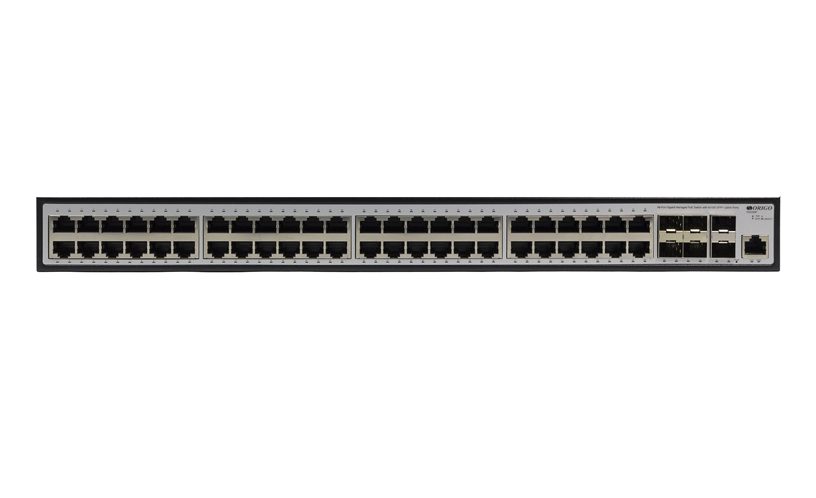 The ORIGO OS3254P is a managed L3 switch featuring 48 x Gigabit PoE+ ports and 6 x 10G SFP+ uplinks, available with 880W or 370W PoE budget.