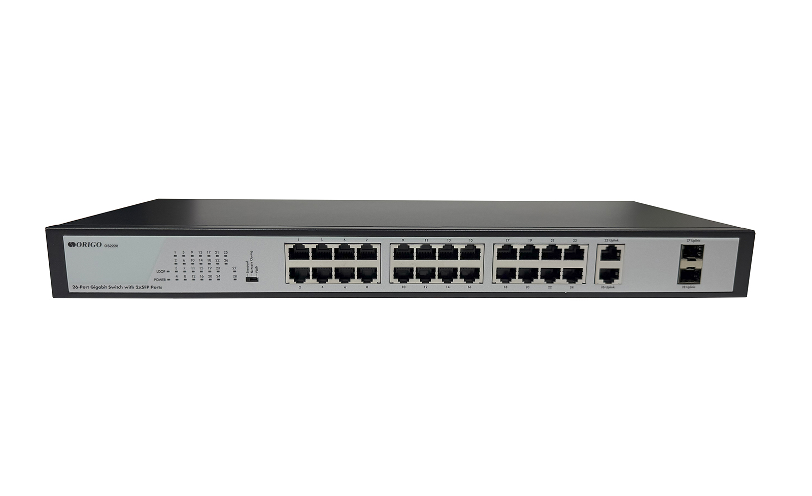 The ORIGO OS2228 switch is a modern gigabit solution with optic uplink ports for connecting workgroups on enterprises, in offices, classrooms and medical facilities.