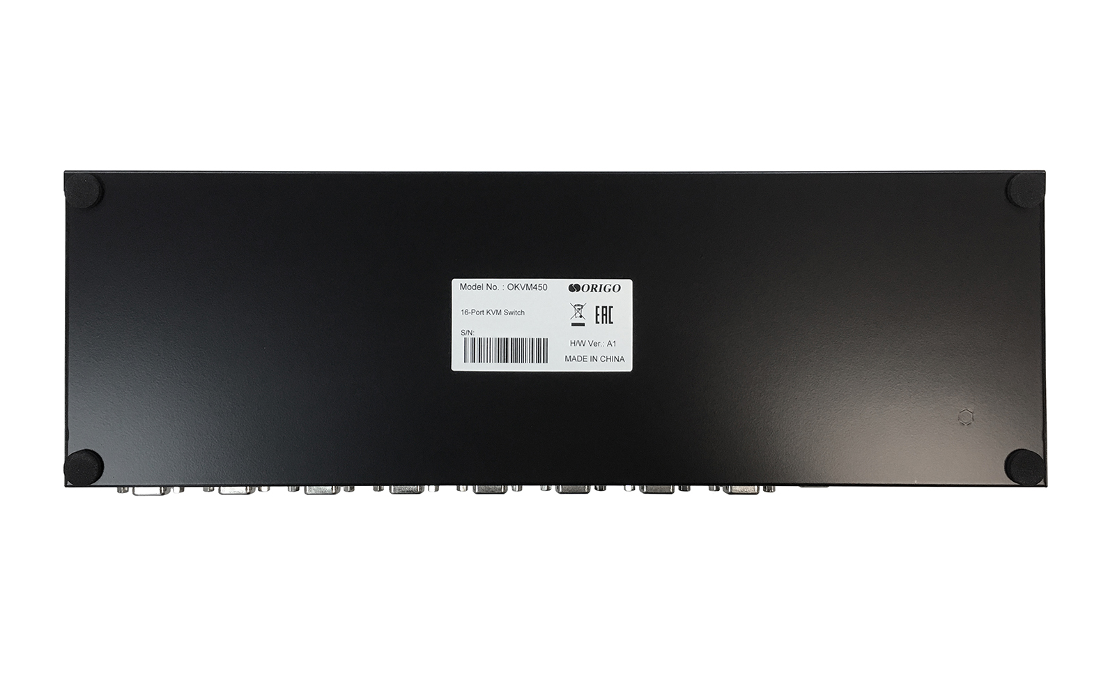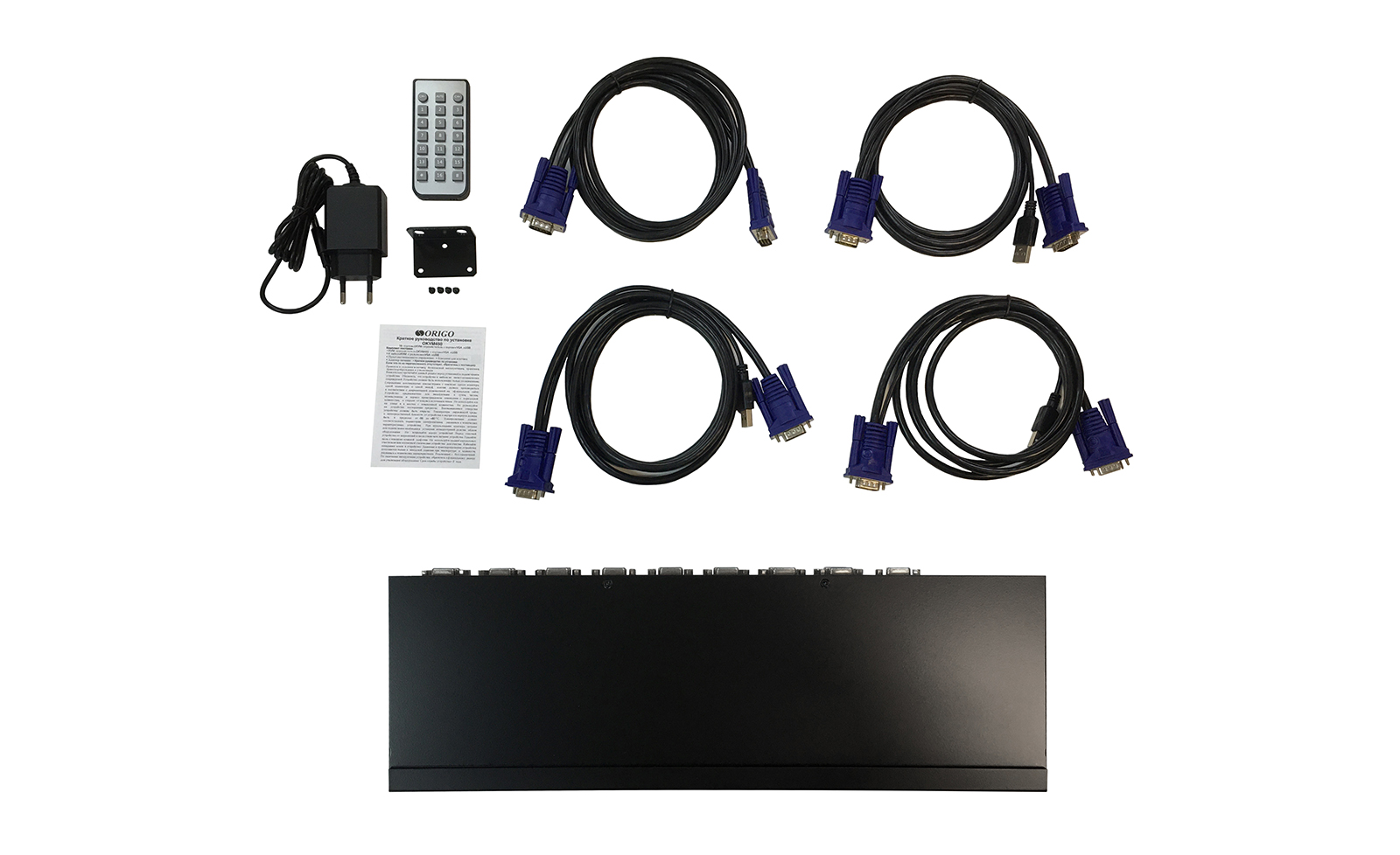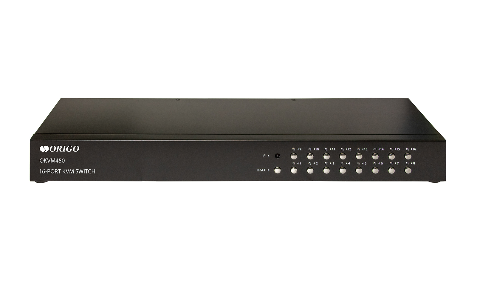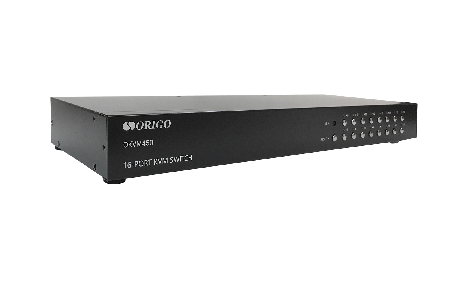 The ORIGO OKVM450 KVM switch allows you to manage up to 16 PCs with one monitor, keyboard and mouse. You can switch between PCs using the buttons located on the front panel or the IR remote controller.