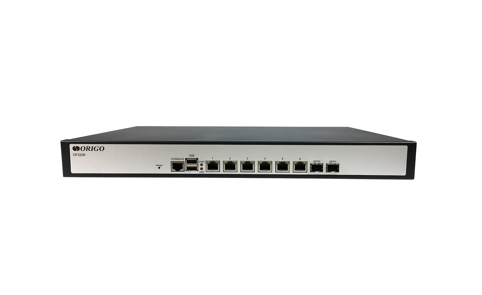 The OF3208 is a network platform with 6x1000Base-T ports, 2х1000Base-X SFP ports, 2xUSB ports and console RJ-45 port.